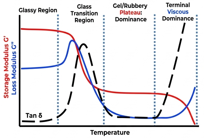 tan(δ) is calculated as the ratio of E''/E'. If tan(δ) is greater than 1 the material is behaving more viscously (damping dominant), and if the value is less than 1 the material is behaving more elastically (stiffness dominant). Tg can be identified from DMA when the storage modulus drops sharply and tan(δ) reaches a peak. The temperature at this peak is taken as the Tg of the material.