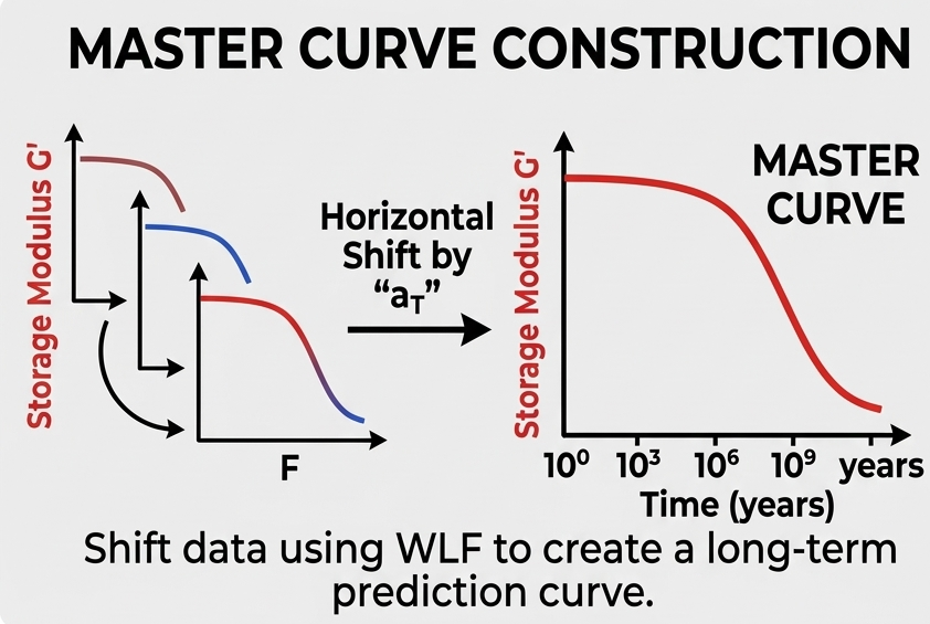 The goal now is to get a master curve that shows storage/loss modulus over time, which can be used to estimate creep and stress relaxation.